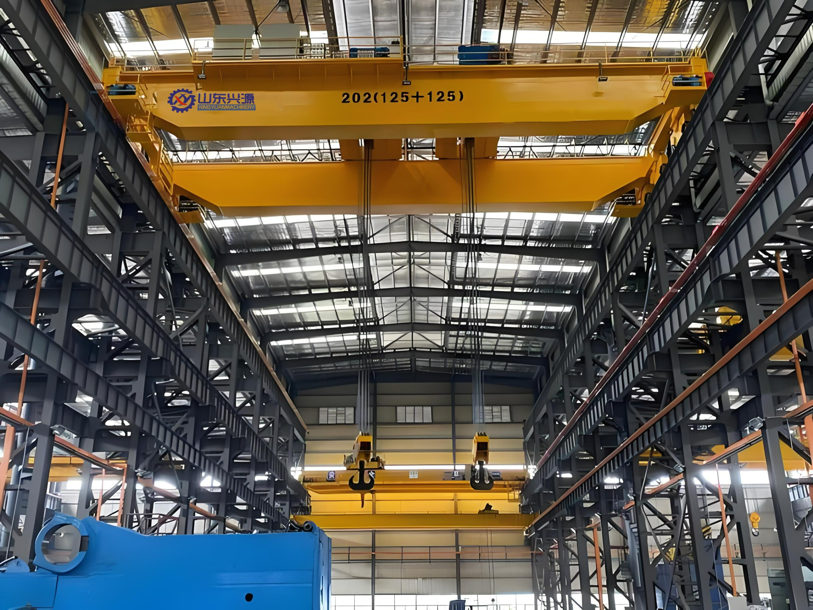 是在QD型橋式起重機(jī)的基礎(chǔ)上,將單小車(chē)改為雙小車(chē),可單鉤獨(dú)立或雙鉤同時(shí)吊運(yùn)物件,主要由橋架、大車(chē)運(yùn)行機(jī)構(gòu)、小車(chē)、電器設(shè)備等組成。